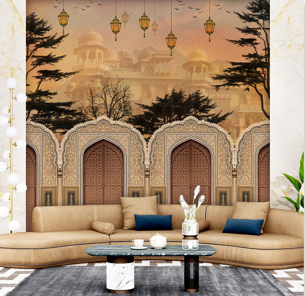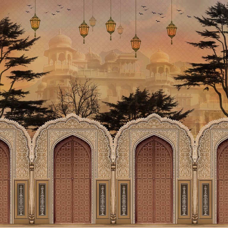 "The Artist's Royal Indian Gateway" wallcovering transports you to a majestic palace in ancient India. This stunning design features ornate archways, intricate carvings, and a breathtaking view of a grand palace in the distance. The warm colors and delicate details create a sense of luxury and sophistication. Perfect for bedrooms, living rooms, or home offices, this wallcovering will add a touch of royalty to any space..