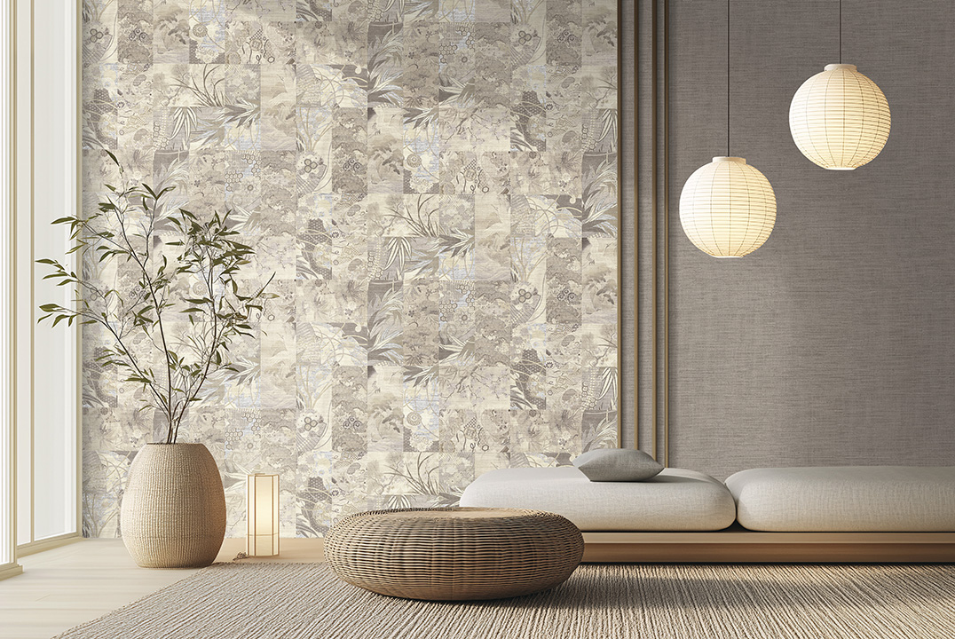 This wallpaper features a beautiful patchwork of Japanese-inspired designs in cool gray and beige tones with soft hints of blue. The varied patterns—from delicate bamboo to striking fans and flying cranes—create a modern, elegant aesthetic with a rich cultural feel..
