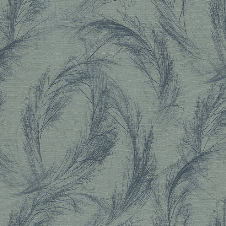 This wallpaper features an elegant, flowing pattern of delicate reed-like fronds in a deep slate blue, set against a calming teal background. The design has a subtle woven texture, giving it a peaceful, coastal feel that is both modern and organic..