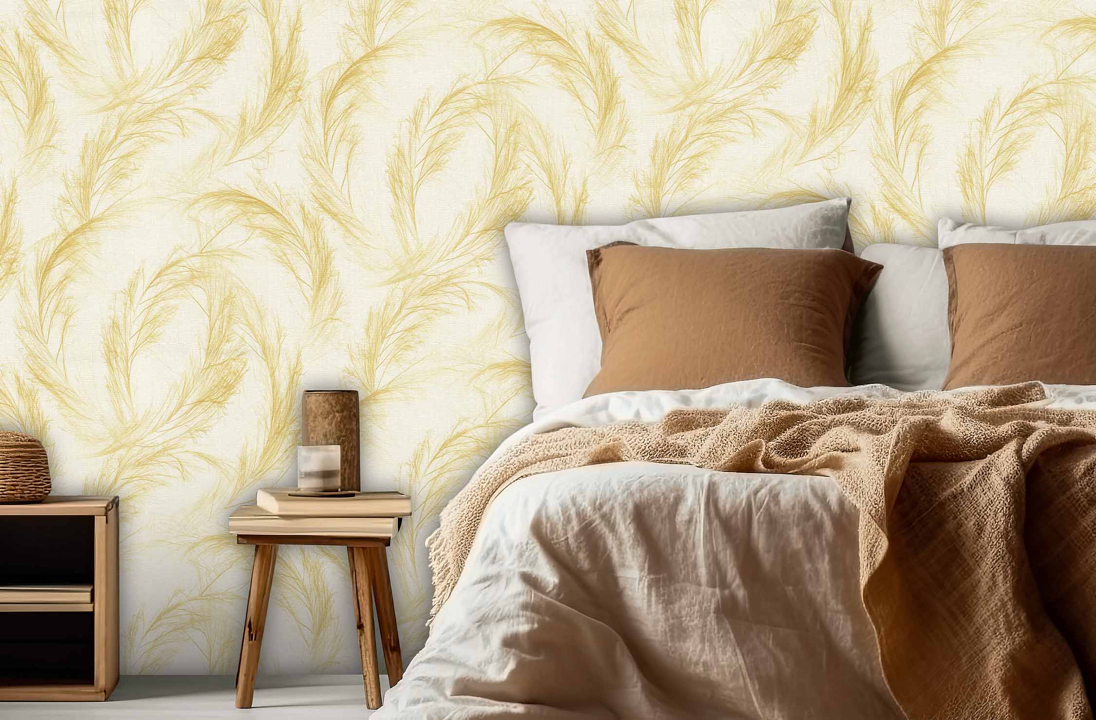 This bright and airy wallpaper features a vibrant golden-yellow frond pattern that stands out against a soft, off-white background. The design is full of light and energy, making it a perfect choice for adding a touch of nature and warmth to a room..