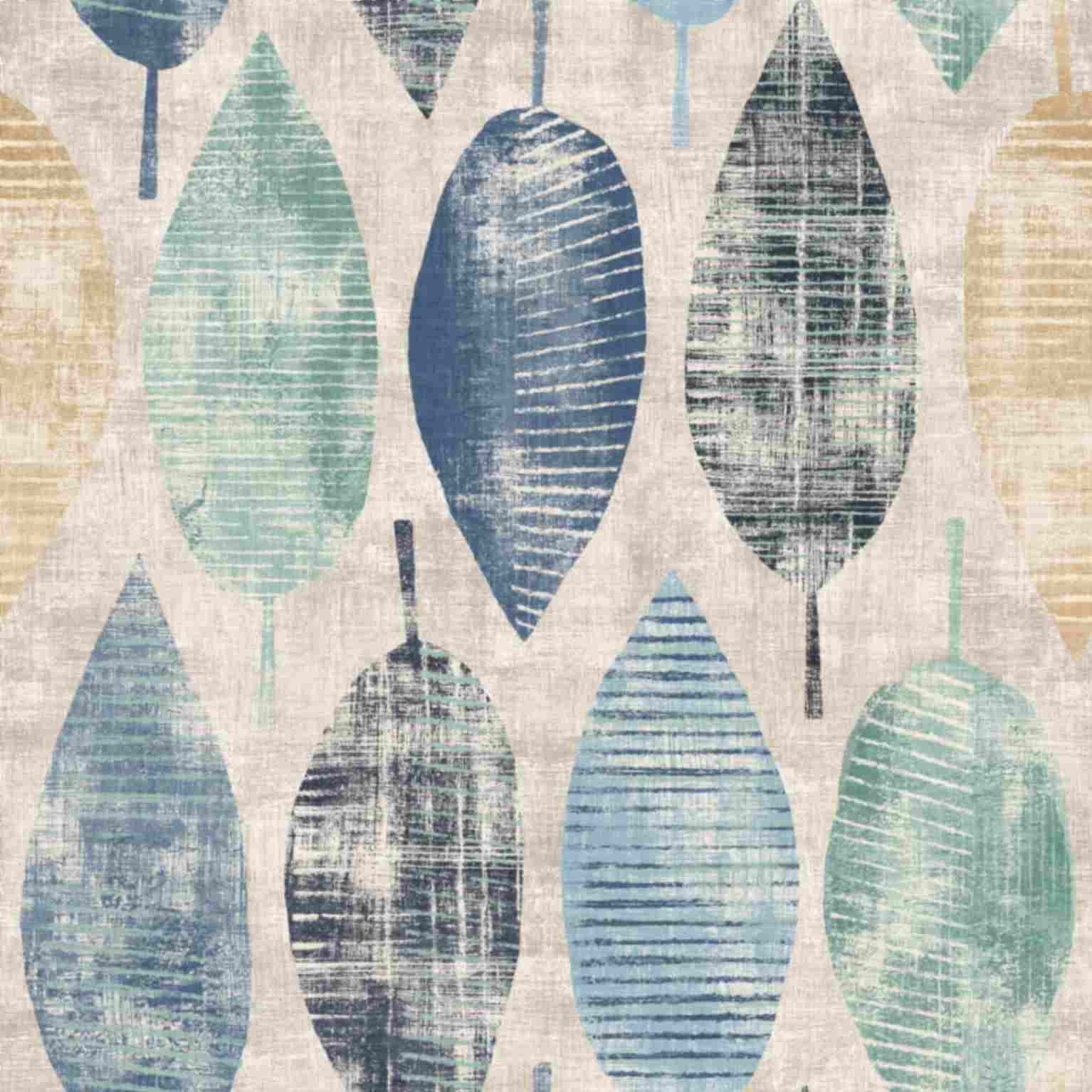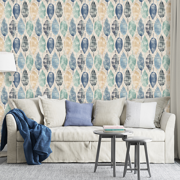This calming leaf-patterned wallpaper features a serene palette of blues, greens, and beige. The textured design creates a tranquil and inviting atmosphere. Perfect for adding a touch of nature to any room..