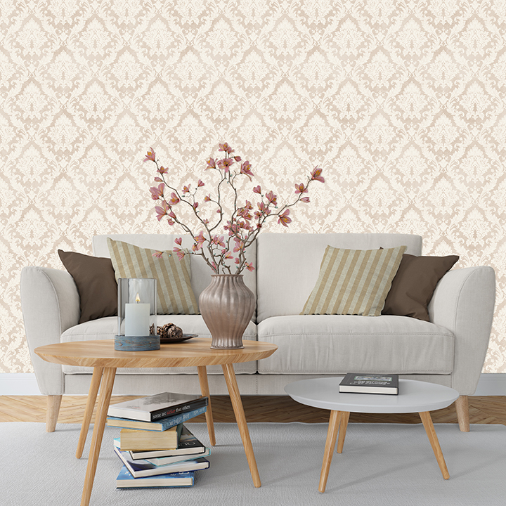 This elegant wallpaper features a classic damask pattern in a soft, off-white hue. The intricate floral motifs and swirling details create a luxurious and sophisticated atmosphere. Perfect for adding a touch of timeless elegance to any space..
