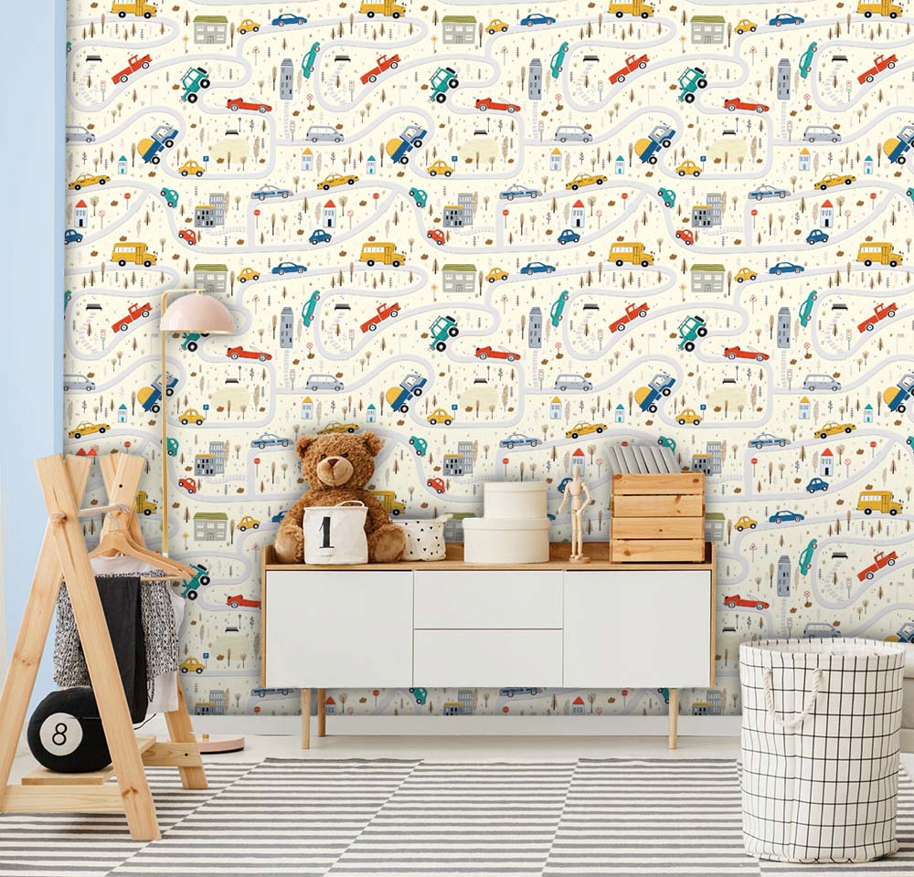 A playful childrens wallpaper featuring various vehicles, roads, buildings, and traffic signs, perfect for a young ones room..