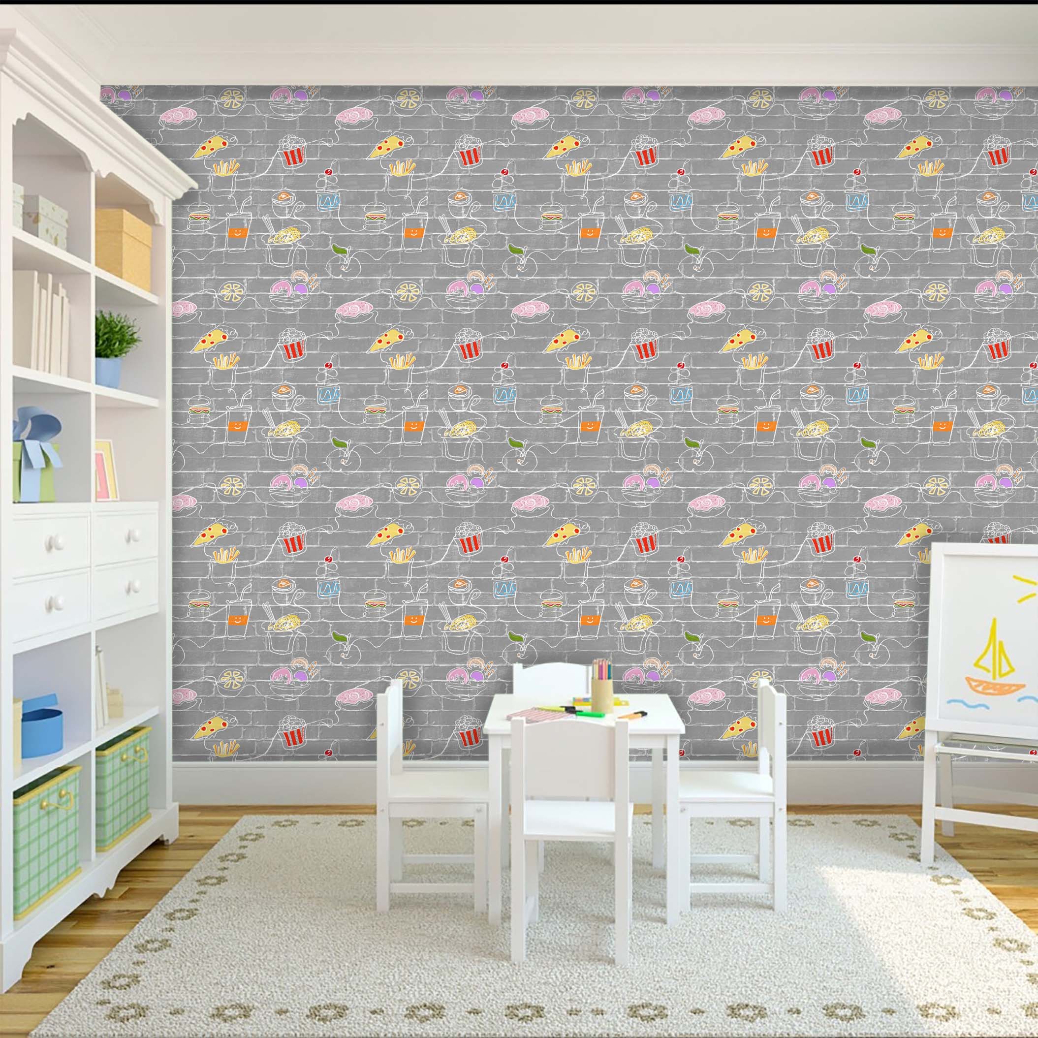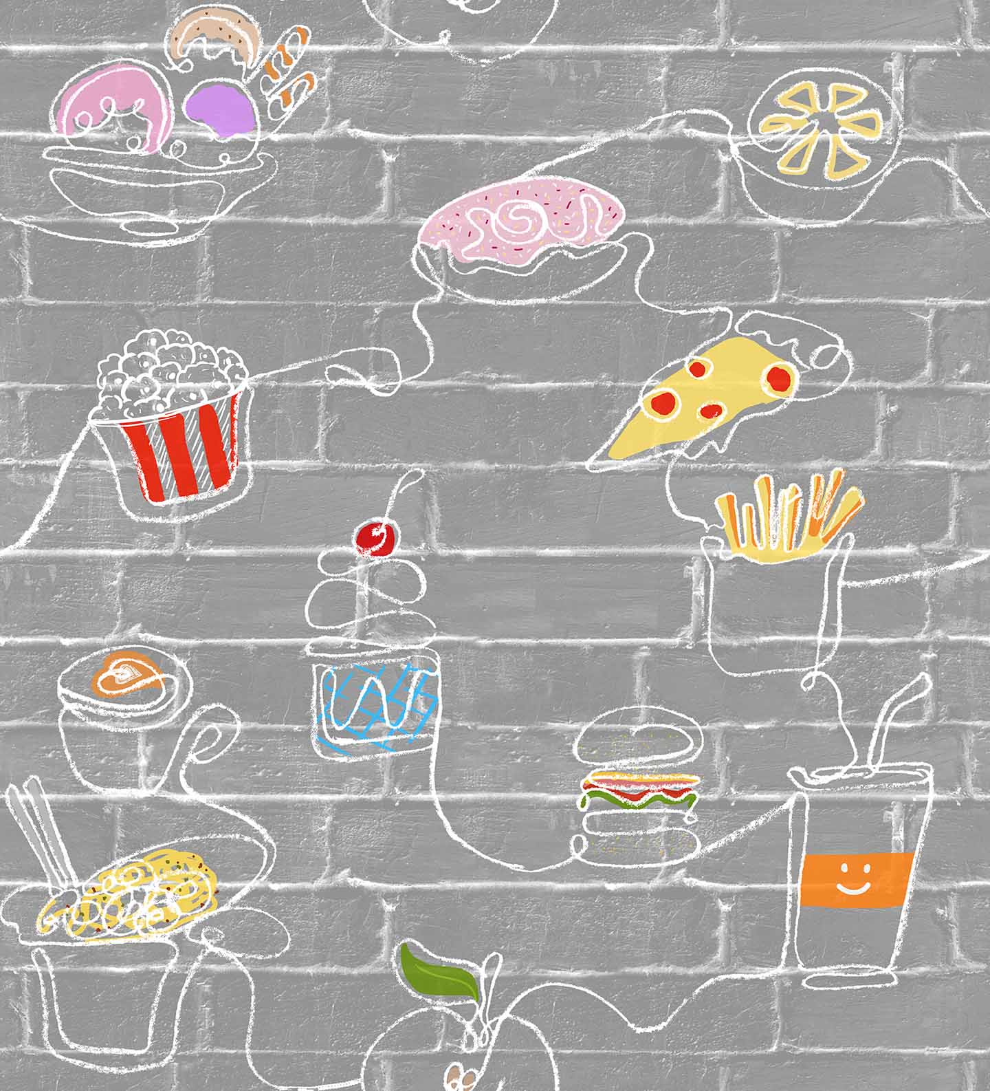 A food-themed wallpaper featuring various delicious treats connected by a continuous line, perfect for a kitchen or dining area..