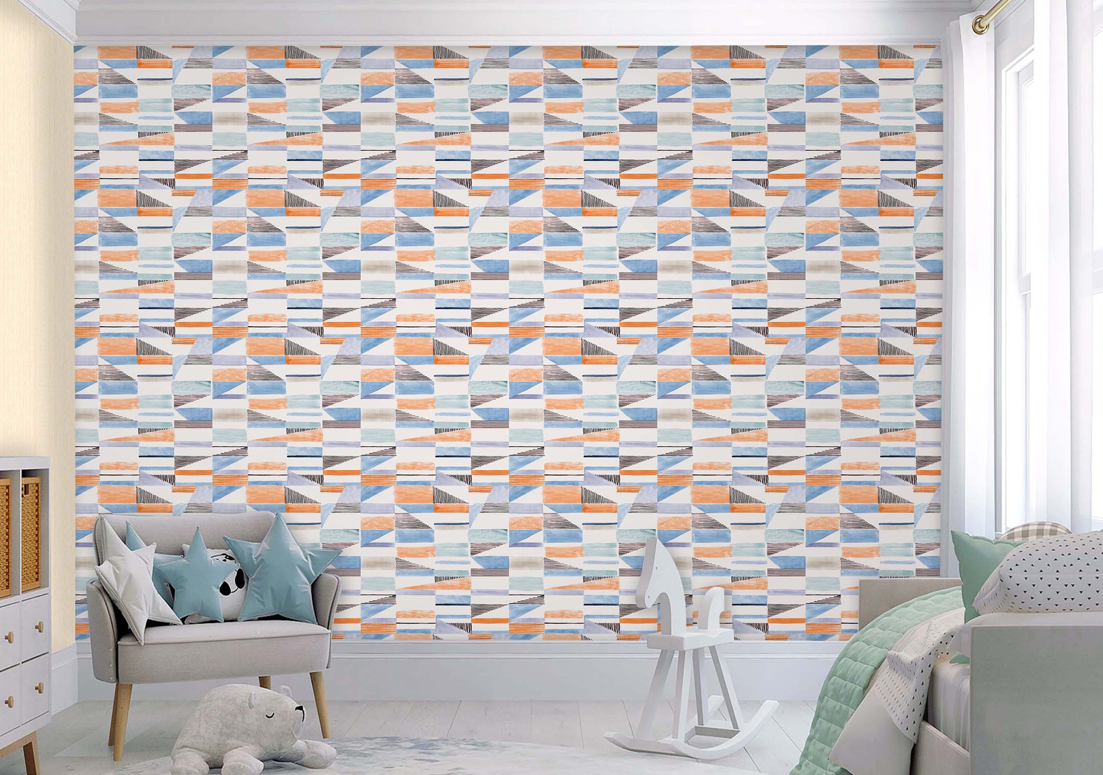 A geometric wallpaper featuring abstract shapes, perfect for a modern or contemporary space..