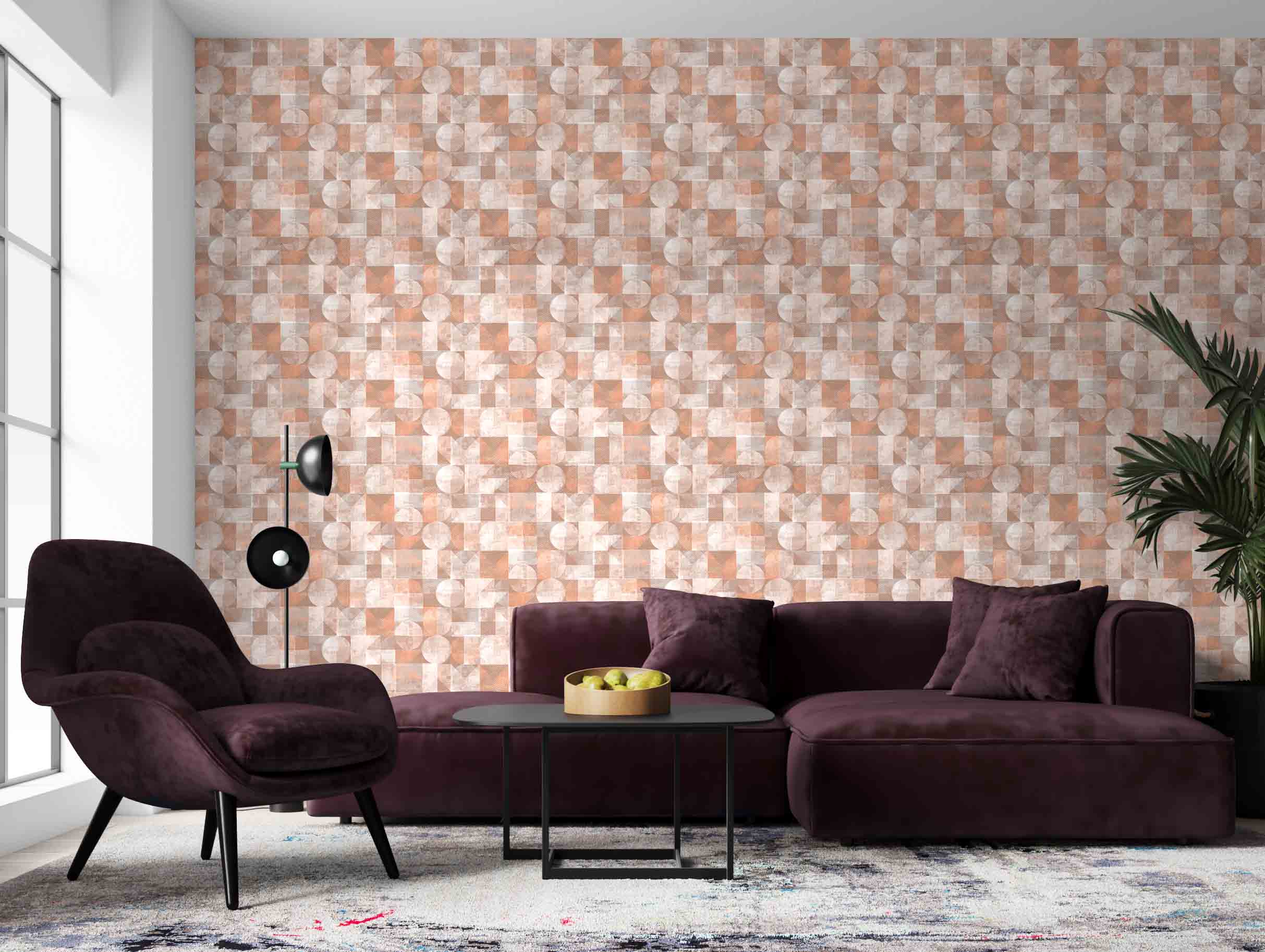 This wallpaper features a geometric pattern with a warm and earthy tone. The design incorporates various shapes, including circles, squares, triangles, and herringbone patterns, all layered over a brown background. The shapes are translucent and overlapping, creating a sense of depth and texture. The overall color palette is muted, with shades of gray, white, and brown, making it a versatile option for various interior styles..