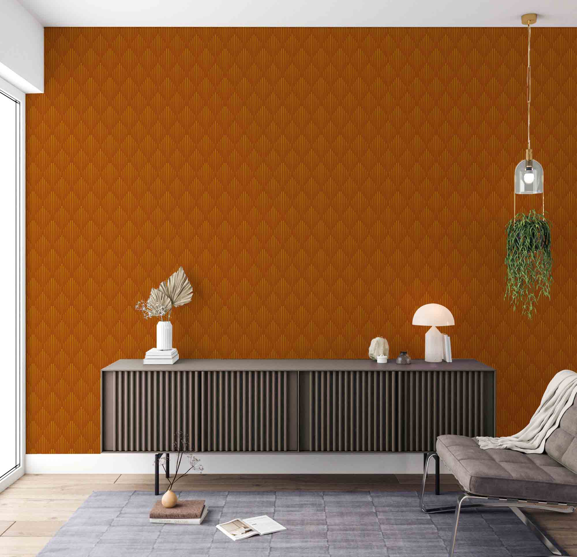 This wallpaper features a minimalist and geometric pattern with vertical stripes arranged in a zigzag pattern. The stripes are gold against a burnt orange background, creating a bold and vibrant look. The design is simple yet sophisticated and can add a touch of drama to any room..