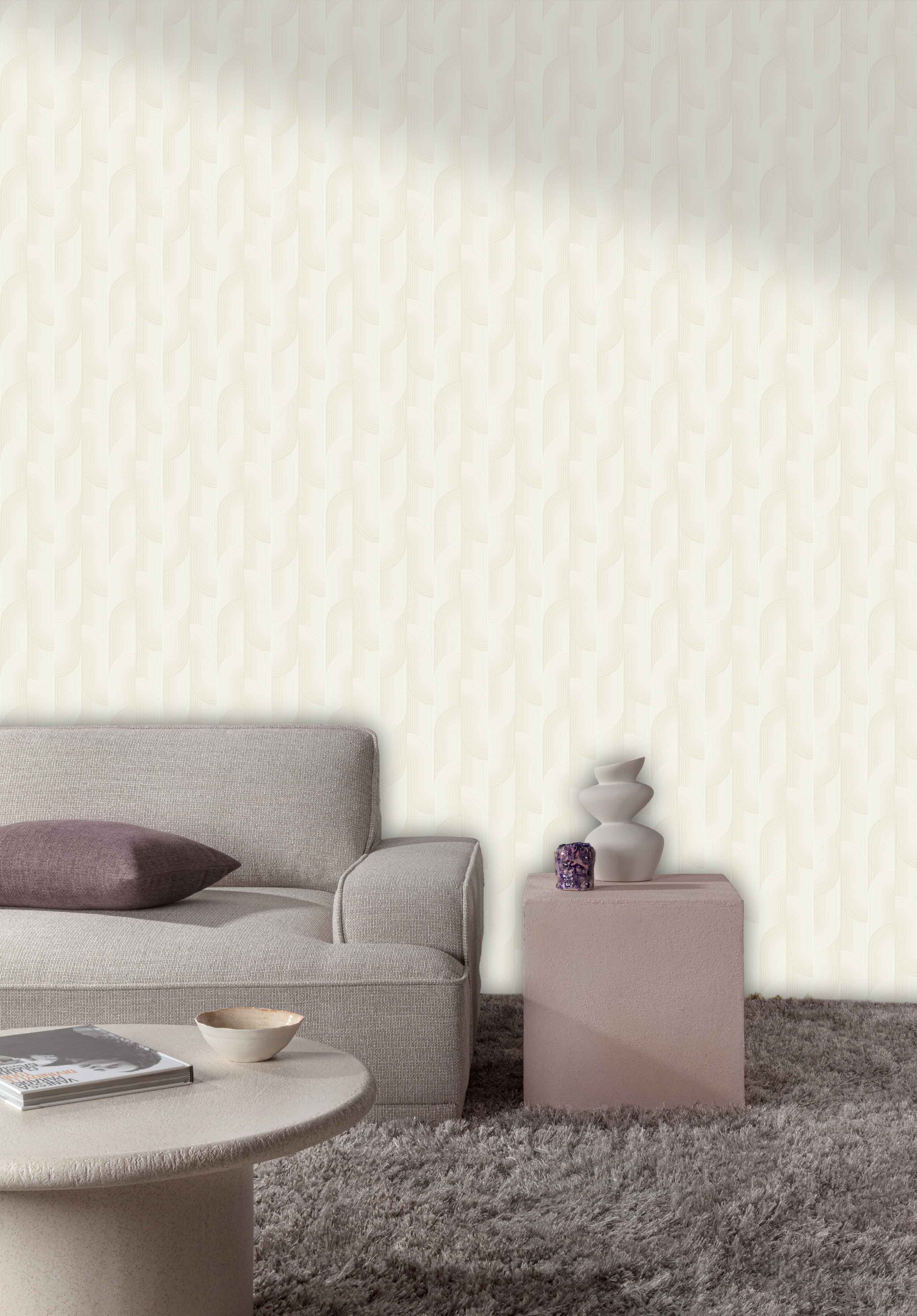 This wallpaper has a soft, off-white color and a gentle horizontal line texture. The faint, organic pattern gives it a natural and calming feel, perfect for a bright, minimalist, or coastal-themed space..