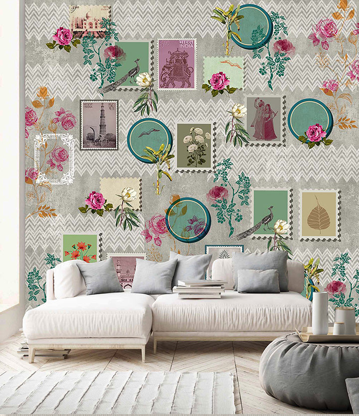 • A contemporary collage of Indian postage stamps, roses, and iconic monuments set against a grey chevron background.