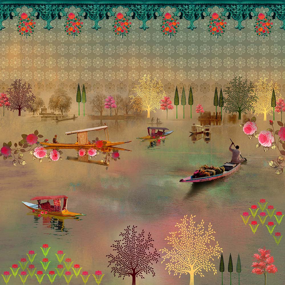 • A warm-toned variation of the lake scene, using ochre and sepia hues to evoke a sunset atmosphere on the water.