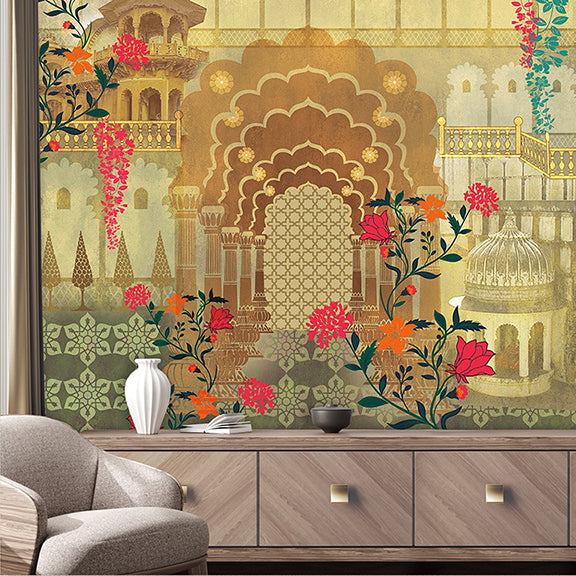 • A golden-hued variant of the archway design, highlighting intricate latticework (jali) and palace silhouettes.