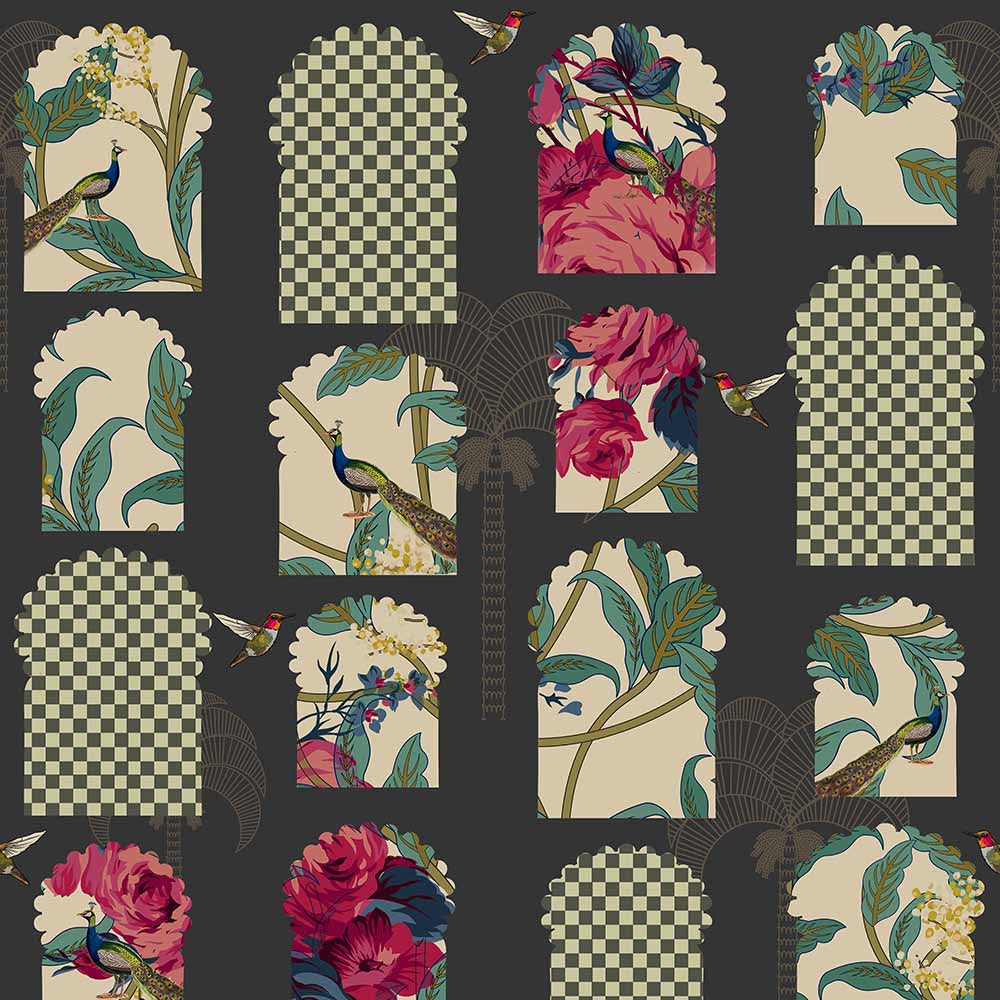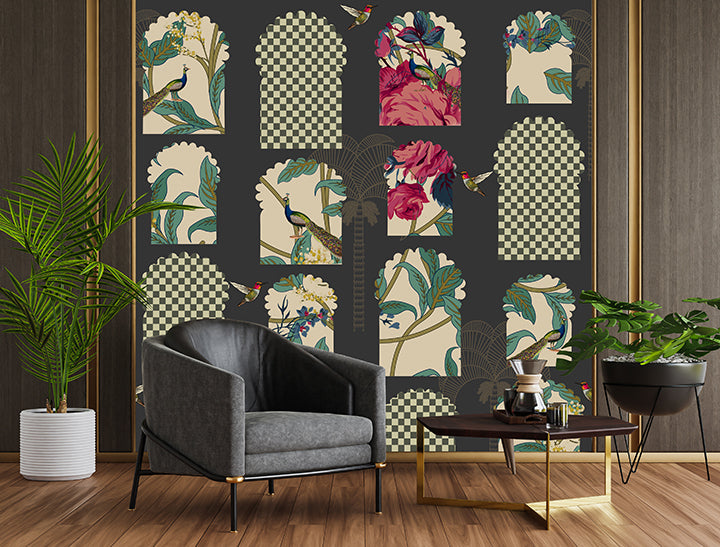 • A dark, moody pattern featuring peacocks and hummingbirds nestled within arched "Jharokha" windows and checkered frames.