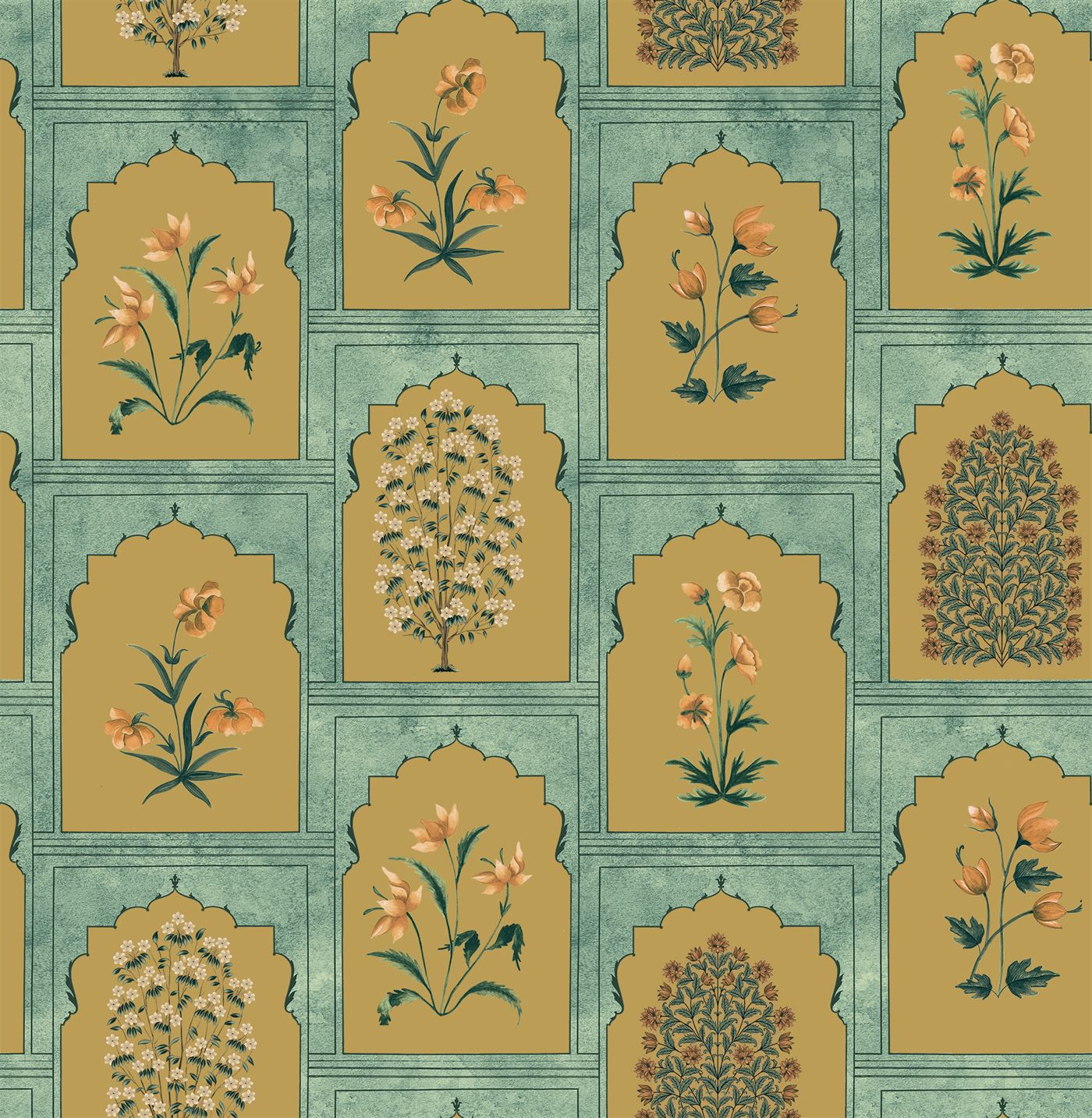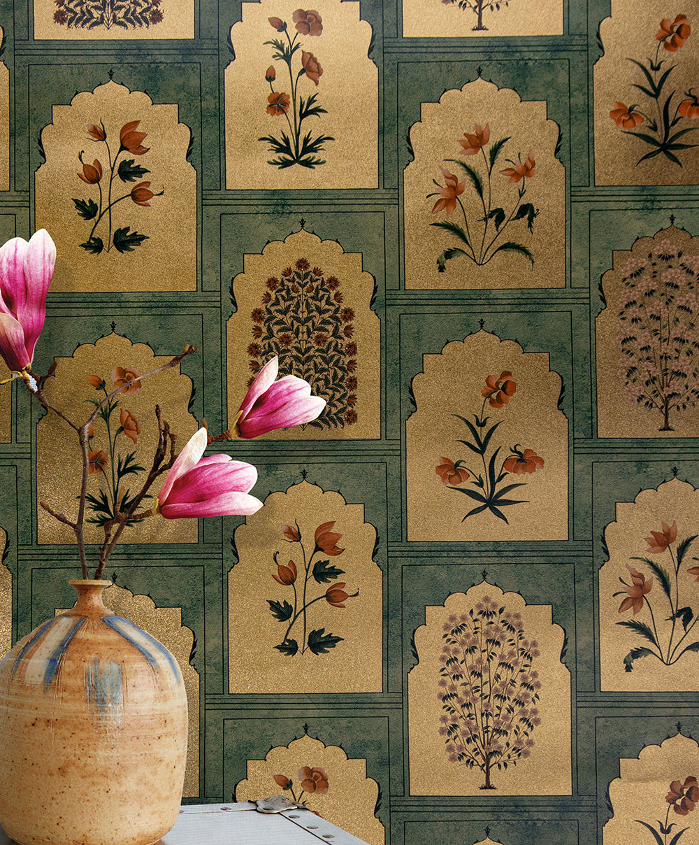 • The Heritage Jharokha wallpaper design draws inspiration from the exquisite jharokha architecture, a hallmark of traditional Indian design known for its intricate balconies and stunning lattice work. This wallpaper beautifully melds architectural elegance with artistic flair, celebrating the rich cultural heritage and craftsmanship that define this iconic style.