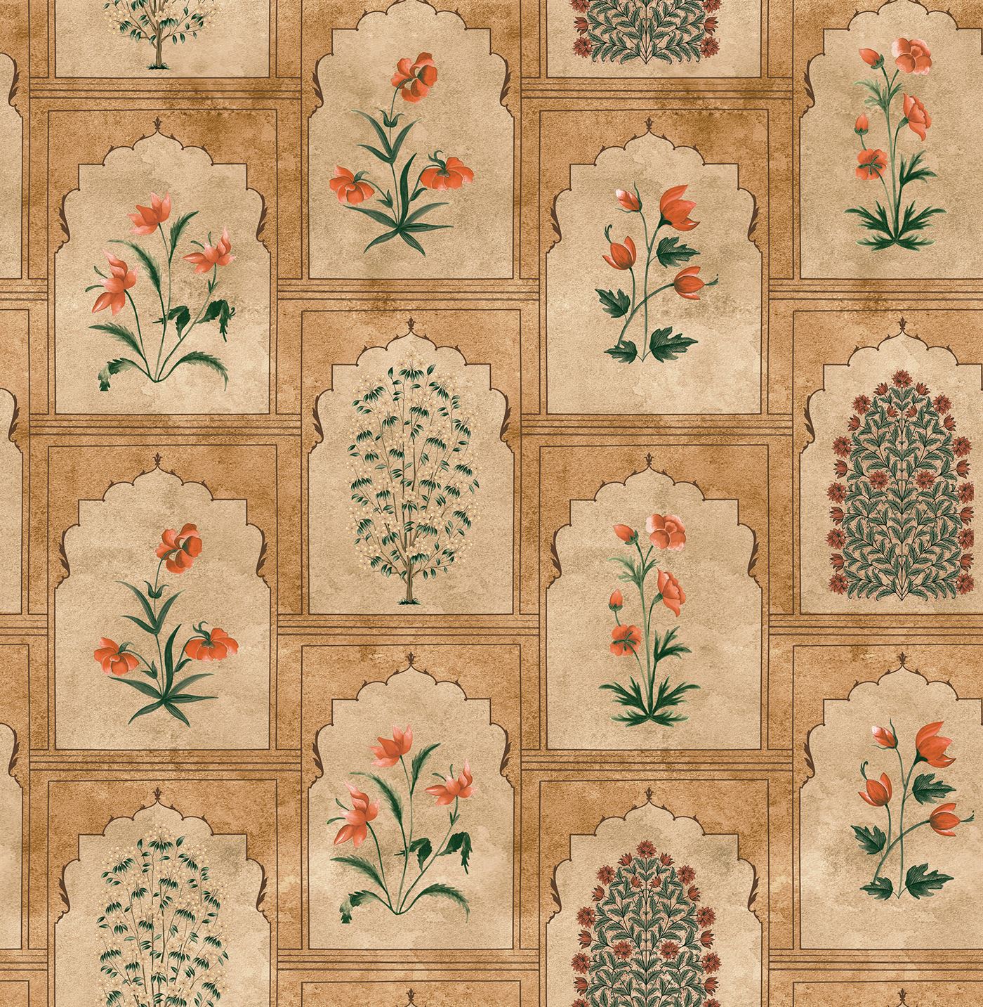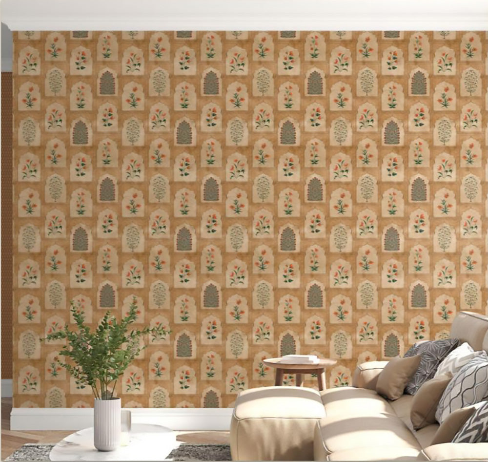 • The Heritage Jharokha wallpaper design draws inspiration from the exquisite jharokha architecture, a hallmark of traditional Indian design known for its intricate balconies and stunning lattice work. This wallpaper beautifully melds architectural elegance with artistic flair, celebrating the rich cultural heritage and craftsmanship that define this iconic style.