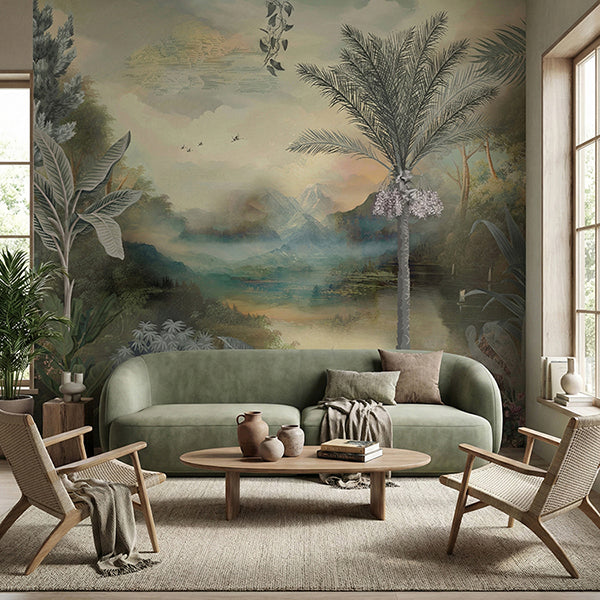 • A rich, immersive tropical landscape with dense foliage and tall palms at sunrise.
