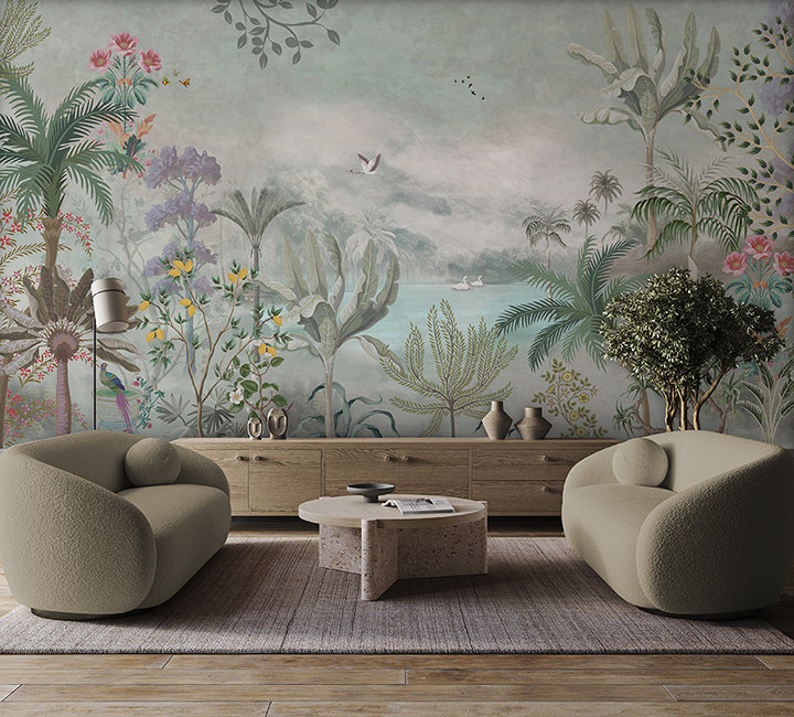• A lush, foreground-heavy botanical design featuring citrus trees and swans on a calm, misty lake.