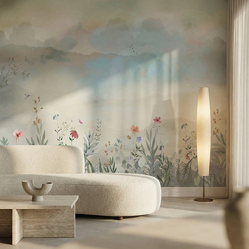 • A modern design featuring colorful wildflowers looking out toward abstract, misty peaks.