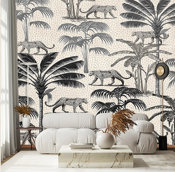 • A sophisticated black-and-white etched pattern of leopards walking through a dense palm and banana leaf forest.