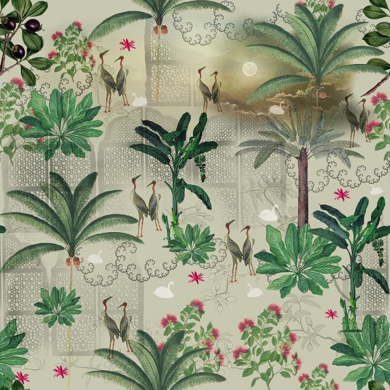 • A vintage-style mural featuring tall palms, elegant cranes, and a soft moonlight glow behind delicate stone jali screens.