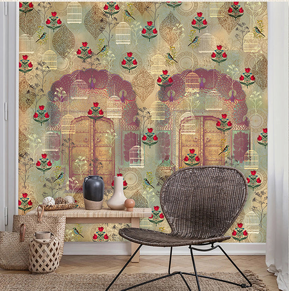 • A warm, cream-colored pattern featuring intricate doors, birdcages, and traditional floral "butas."