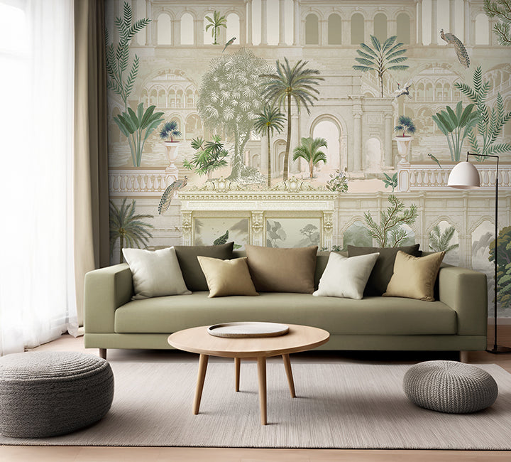 • An intricate architectural mural featuring classical arches, palm courts, and a peacock overlooking a grand estate.