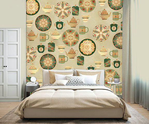 • A whimsical, collage-style design featuring antique teapots, cups, and patterned saucers in teal and gold.