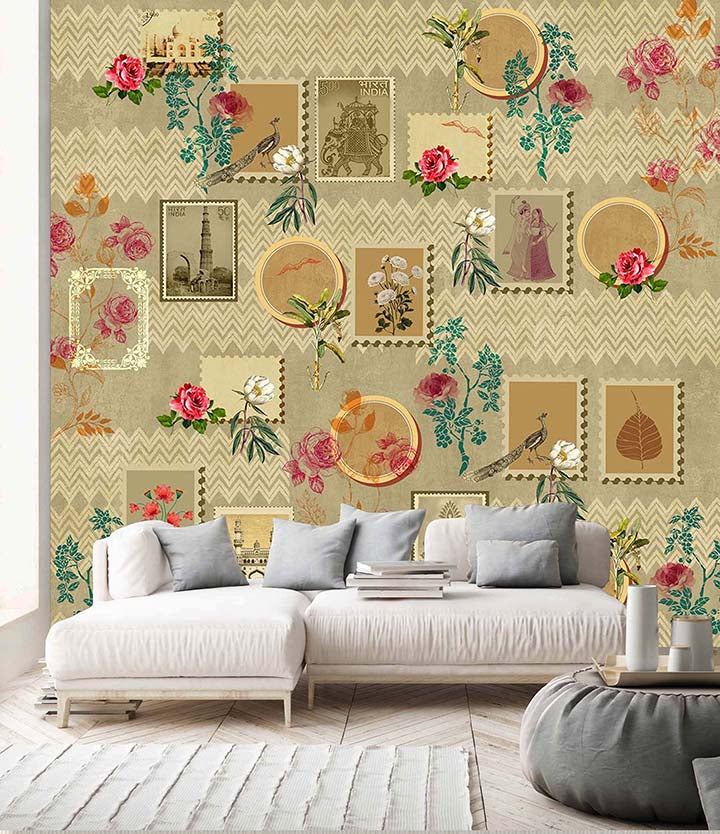 • A sepia and tan version of the stamp collage, offering a nostalgic, aged-paper feel with vibrant floral accents.